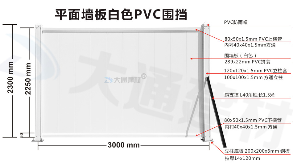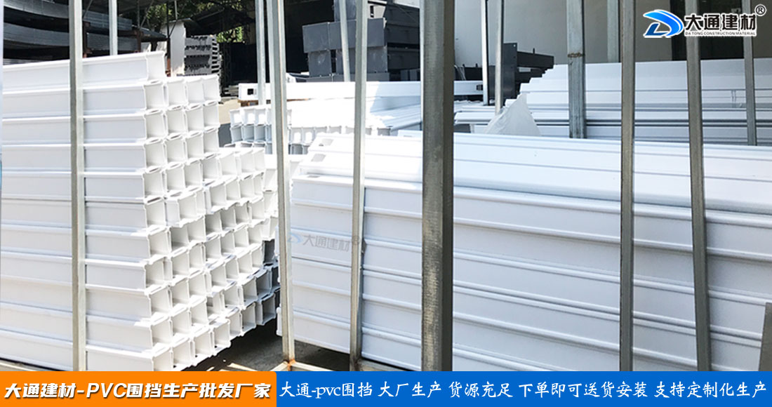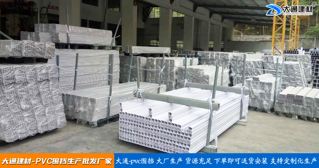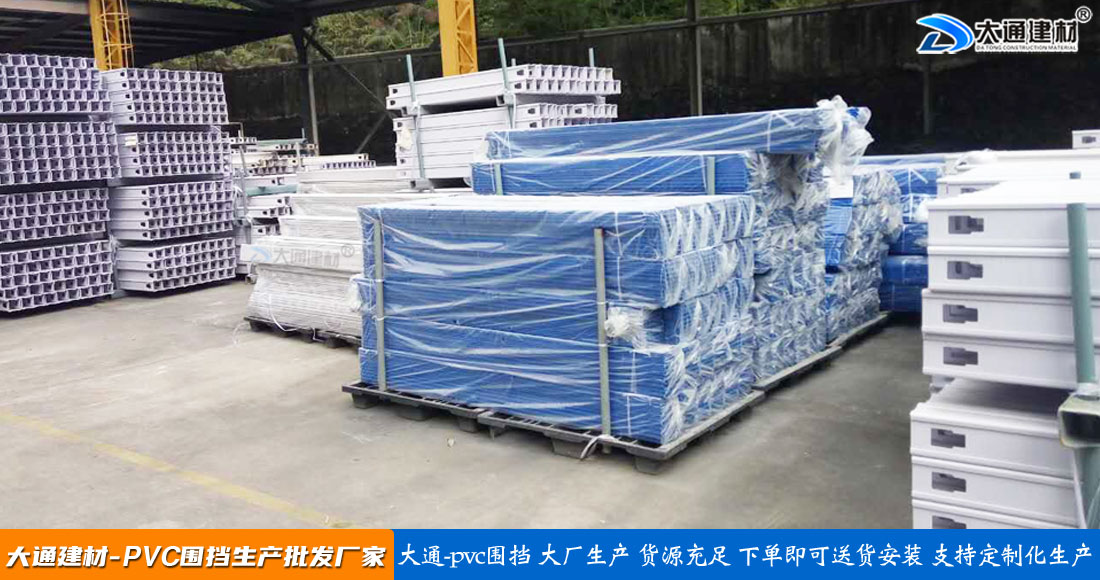 大通建材PVC圍擋立柱、橫管、擋板、斜支撐、橫撐加強筋等部件按照設計與生產標準,尺寸與工藝實現標準化生產和標準化拼接安裝,從而達到高效率生產、快速運輸和拼接式安裝,大大降低了圍擋的采購成本。